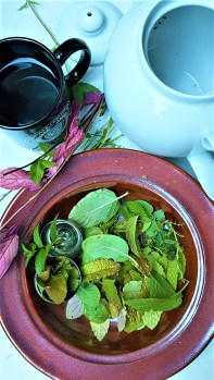 Preparing a tea using fresh herbs from the garden